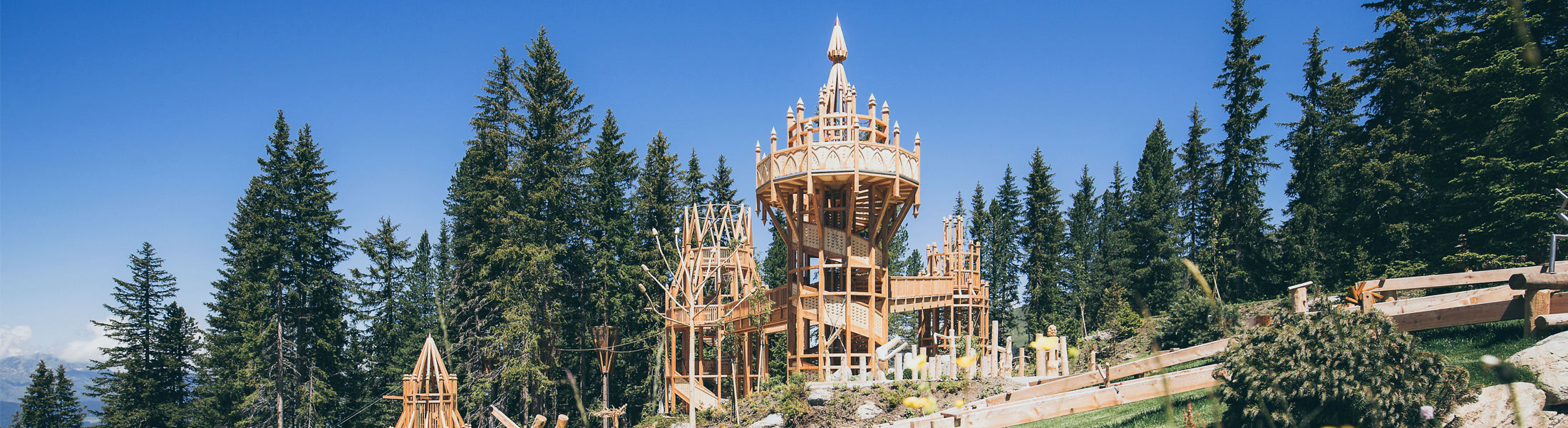 Über 5.000 m² "Schloss-Areal" 4 begehbare Türme (Rutschenturm, Kranturm, Kletterturm, Aussichtsturm) Erlebnis-Spielplatz Wasserspiel- und Sandspielbereich Baumwipfelweg Fichtenwichtel-Bauhütte Genuss und Relaxplätze für Groß und Klein Schlossküche mit Grillplatz